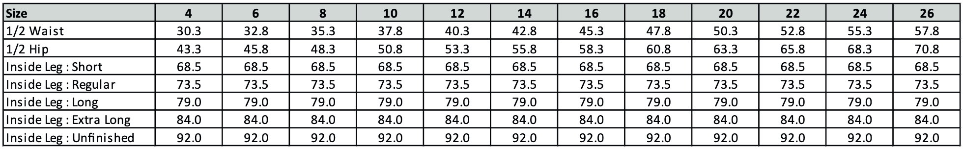 Straight leg, slim waistband, with belt loops & key loop, 2 side pockets, mock rear pockets.
